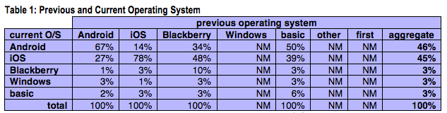 Another important find is how the big two continue to destroy the competition. 34% of Blackberry users have changed to Android while 48% of Blackberry users headed to Apple. According to the report the real battle here is the percent of people who have yet to choose a smartphone. So far Android is winning the newcomers gathering 50% of basic phone users, while 39% are choosing iOS.