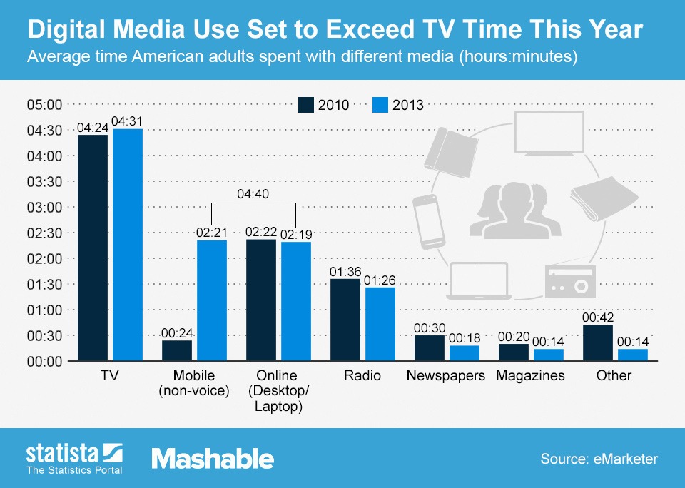 According to the latest media consumption study by eMarketer the average adult spends 5 hours a day on non-voice digital media compared to 4 hours and 31 minutes watching TV. Furthermore an expected decrease in TV consumption is expected this year, while digital consumption will shoot up 15.8 percent.